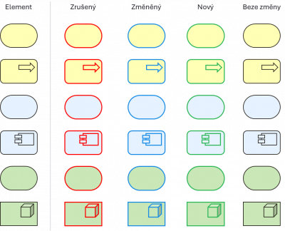Možná barevná notace pro indikaci změn na diagramech (zde pomocí barvy okrajů, lze ale také přebarvit celou plochu objektu)